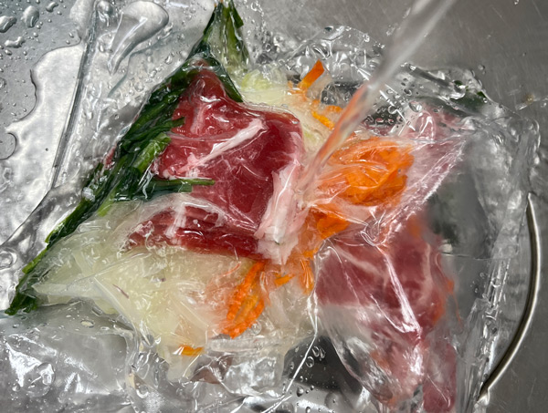まず冷凍の具材を数分ほど流水にあて、ちょっとだけ柔らかくします。完全に解凍するのではなく、ホットクックの内鍋に入れやすくなる程度に柔らかくなれば大丈夫です。