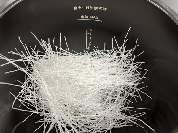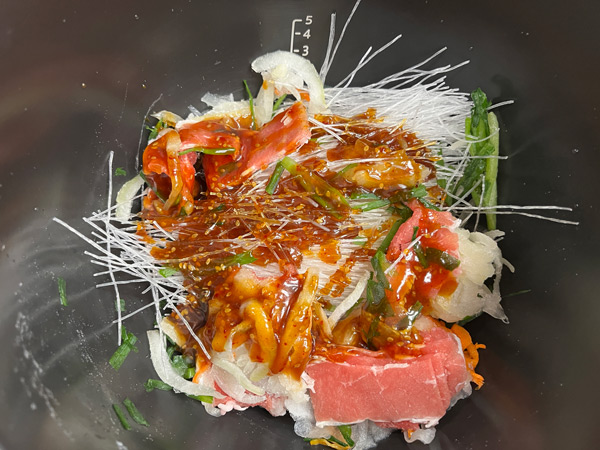 内鍋に春雨、具材を入れ、上からまんべんなくタレをかけます。