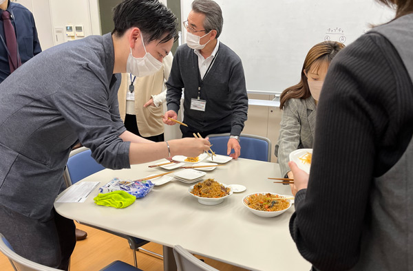 試食した社員は「ちょっと濃いめの味つけがご飯に合いそう」「春雨の食感がいいですね」と感想を口にしながらもどんどん箸が進み、用意した試食のチャプチェはあっという間になくなってしまいました!