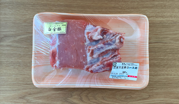 こちらが6月お届けの白金豚です。冷凍の状態で届きますので、調理する1日前から冷蔵庫に移して解凍します。重さ500gの迫力ある大きな塊が2パック届きます!