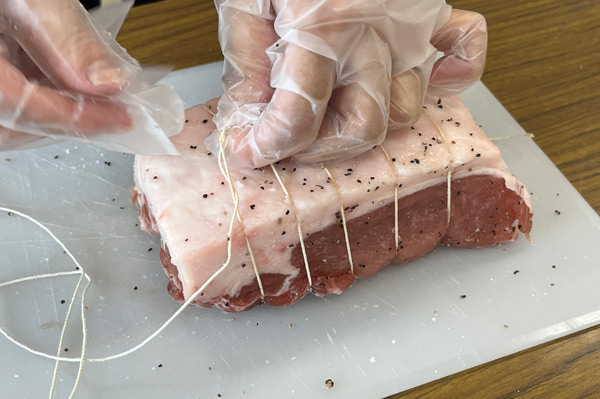 塩こしょうをして、タコ糸でしばっていきます。「タコ糸で縛って形を整えたほうが、できあがりがキレイですよ」とのことです。