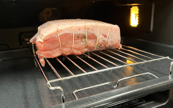 (福岡) 白金豚のおいしさをシンプルに味わっていただくためのレシピにしようと思いました。いわゆるローストポークですが、<AX-XA30>独自の、食材の表面を焼きつける“あぶり焼き”と“低温調理”を組み合わせた「あぶり豊潤焼き」機能を使って焼き上げます。