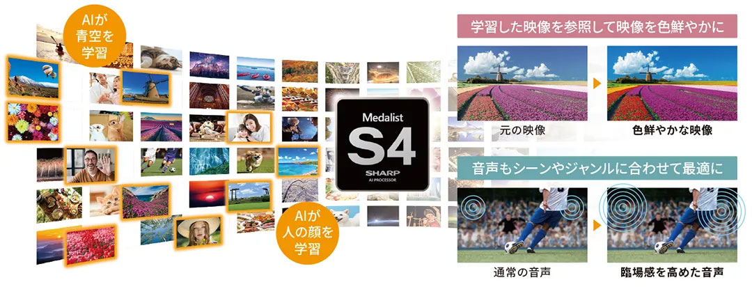 最大の特長は、100万以上の映像を学習したAIが人の顔や空などを検知するとともに、映画やドラマ、スポーツなど、放送番組のジャンル情報もあわせて判断し、画質や音質を自動で調整することです。画質のAI調整は、昨年発売の製品から対応していましたが、最新のAIプロセッサー採用の新画像処理エンジン「Medalist S4」搭載により、新たに音質の自動調整も可能になりました。