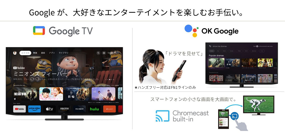 Google TV 」を搭載しているほか、 Google アシスタント 」にも対応しています。<FN1>ラインはハンズフリー音声操作対応で、テレビに話しかけることで、リモコンに触れずに、映画検索、音楽再生、音量操作、電源のオン・オフなどができます。映画や動画、ゲーム、その他アプリ等、スマホの画面を直接テレビにキャストできる「 Chromecast built-inTM 」も搭載しています。「 Google TV 」については、テレビ向けに公開されているネット動画のアプリはほぼ使えると思います。対応アプリの多さには自信があります。