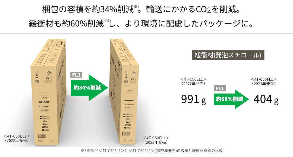 • ※3 新製品<4T-C50FL1>と<4T-C50EL1>(2022年発売)の容積と緩衝材質量の比較。