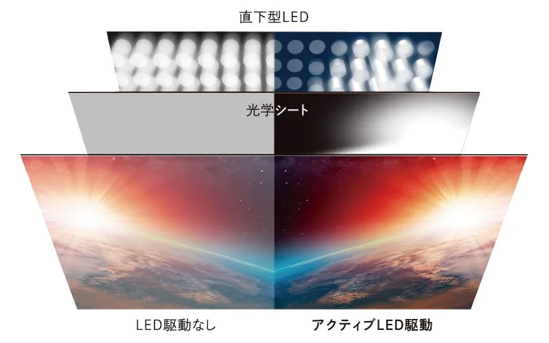 4K液晶テレビの最上位モデル<FN1ライン>は、当社の最高峰フラッグシップモデル『AQUOS XLED』の開発で培ったバックライト制御技術を応用した「アクティブLED駆動」を採用しています。直下型LEDバックライトの光量をエリアごとに細かく制御し、コントラスト性能を高めました。