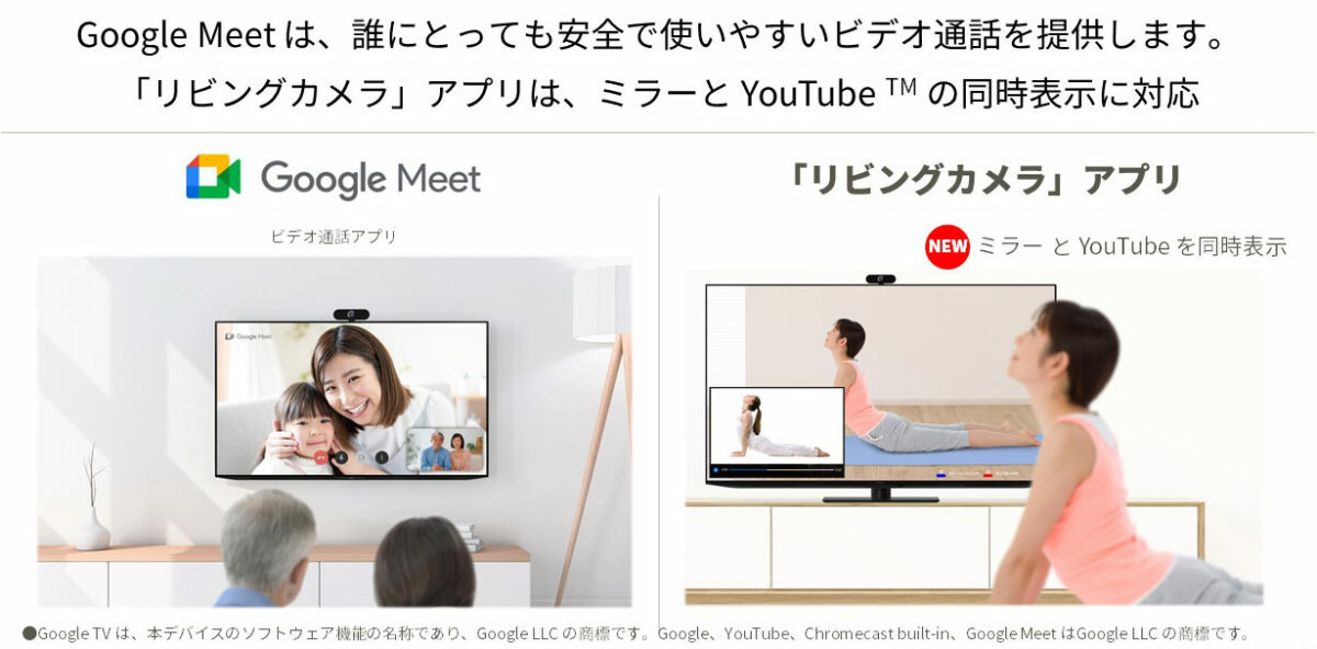 また、テレビ画面を鏡のように使用(ミラー機能)して身だしなみを確認したり、リビングで家族写真を撮影できたりする自社開発のカメラアプリ「リビングカメラ」が進化し、YouTube TM 動画とミラーの同時表示が可能になりました。例えば、ヨガやダンス等のインストラクターが実演する動画を大画面で視聴しながら、自身のポーズやフォームの確認ができます。