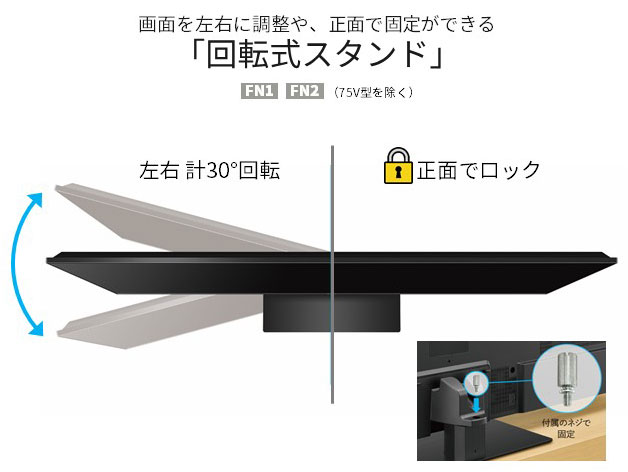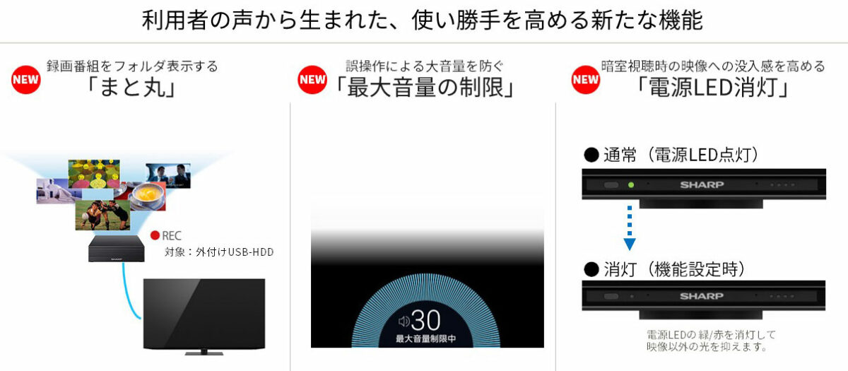 ほかにも、USBハードディスク(別売)の録画番組を番組名ごとにフォルダ表示する「まと丸」機能や、誤操作による大音量を抑制する「最大音量の制限」機能電源のLEDを消去し映像への没入感を高めることができる「電源LED消灯」、画面を左右に計30度調整できる「回転式スタンド」(FN1(75V型除く)/FN2ライン)など、お客様の声から生まれた、使い勝手を高める様々な便利機能を採用しています。
