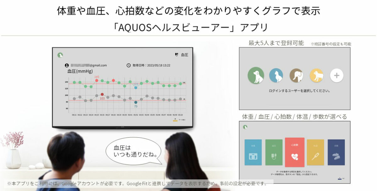 さらに、歩数や心拍数、体重、血圧などの変化をわかりやすくグラフで表示する「AQUOSヘルスビューアー」アプリを開発し、プリインストールしています。「Google Fit」対応機器と連携し、各機器が測定した情報をグラフでテレビの大画面にわかりやすく表示し、日々の健康管理をサポートします。家族でコミュニケーションを取りながら、健康意識を高めるアプリを作れないかとの考えで開発しました。また、家族や周りに見せたくない方のために、アカウントにパスワードをかけることも可能です。