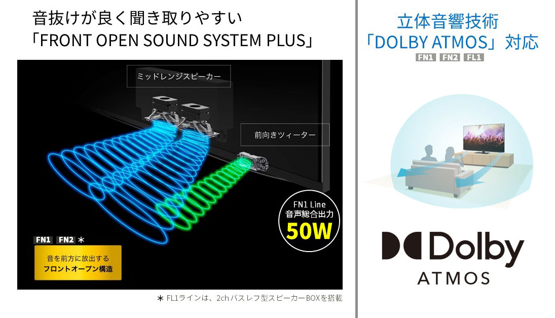 音質についても、<FN1/FN2ライン>は、臨場感豊かな音を届ける高音質設計「FRONT OPEN SOUND SYSTEM PLUS」を採用しています。音を前方に導く機構なので、音抜けが良く聞き取りやすくなっています。また、新製品全ラインで「Dolby Atmos®に対応し、劇場にいるような立体音響をご家庭で手軽に楽しめます。