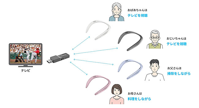 さらに、ニュースを見ている時や、野球を見ていて応援しているチームがチャンスの場面などに、テレビの前から離れなければならなくなった経験はありませんか?<AN-SS3>を付けていれば、テレビの前から離れても音声で状況が分かります。ほかにも、子育て中の親が、子どもを起こさずにテレビを楽しめるということで感謝のメールもいただきました。