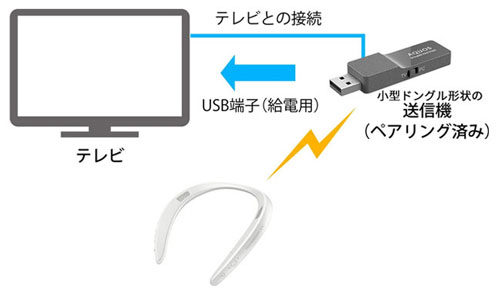新製品は使いやすさにこだわっています。送信機は本体とペアリング済みなので、使い始める際の面倒な設定が不要です。テレビ視聴の場合、送信機を(電源供給のために)テレビのUSB端子にさして、テレビのヘッドホン端子と送信機を付属のオーディオケーブルでつなげば、すぐに使用できる簡単接続になっています。なお、送信機は使いやすいUSB端子一体の小型ドングル形状です。