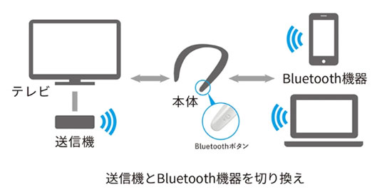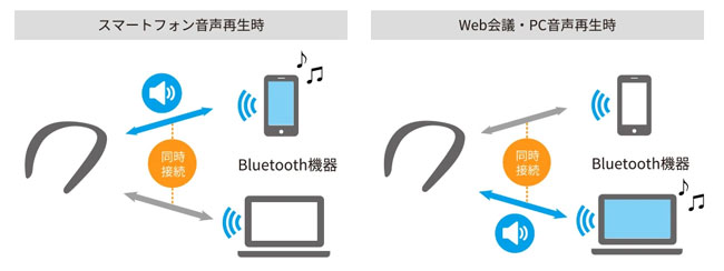 テレビ視聴には送信機が必要ですが、Bluetooth接続が可能なPC、スマホ、タブレットなど(Bluetooth機器)は、送信機を使わずに直接Bluetoothで接続し、音声を聴くことが可能です。2台まで同時接続できるので、接続しなおすことなく、スマホの音楽を楽しんだ後、速やかにWeb会議に参加することが可能(「マルチポイント接続」)です。
