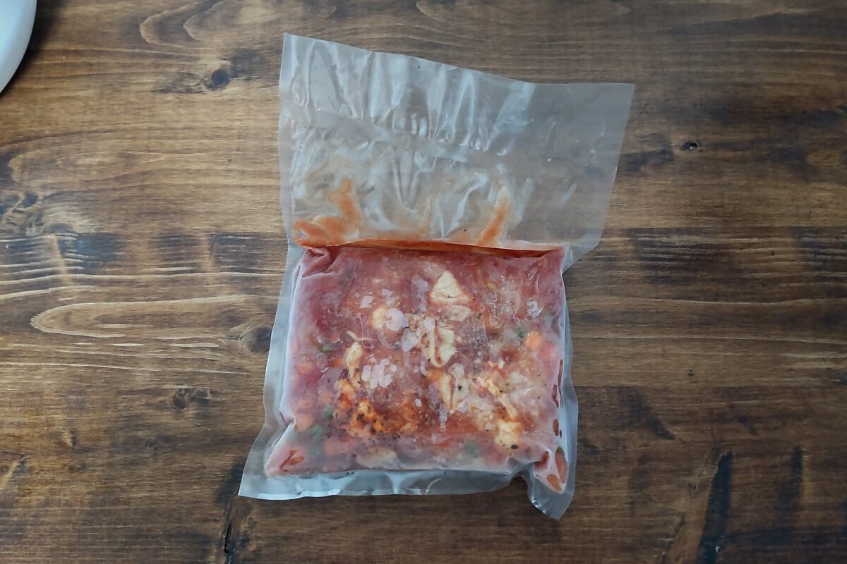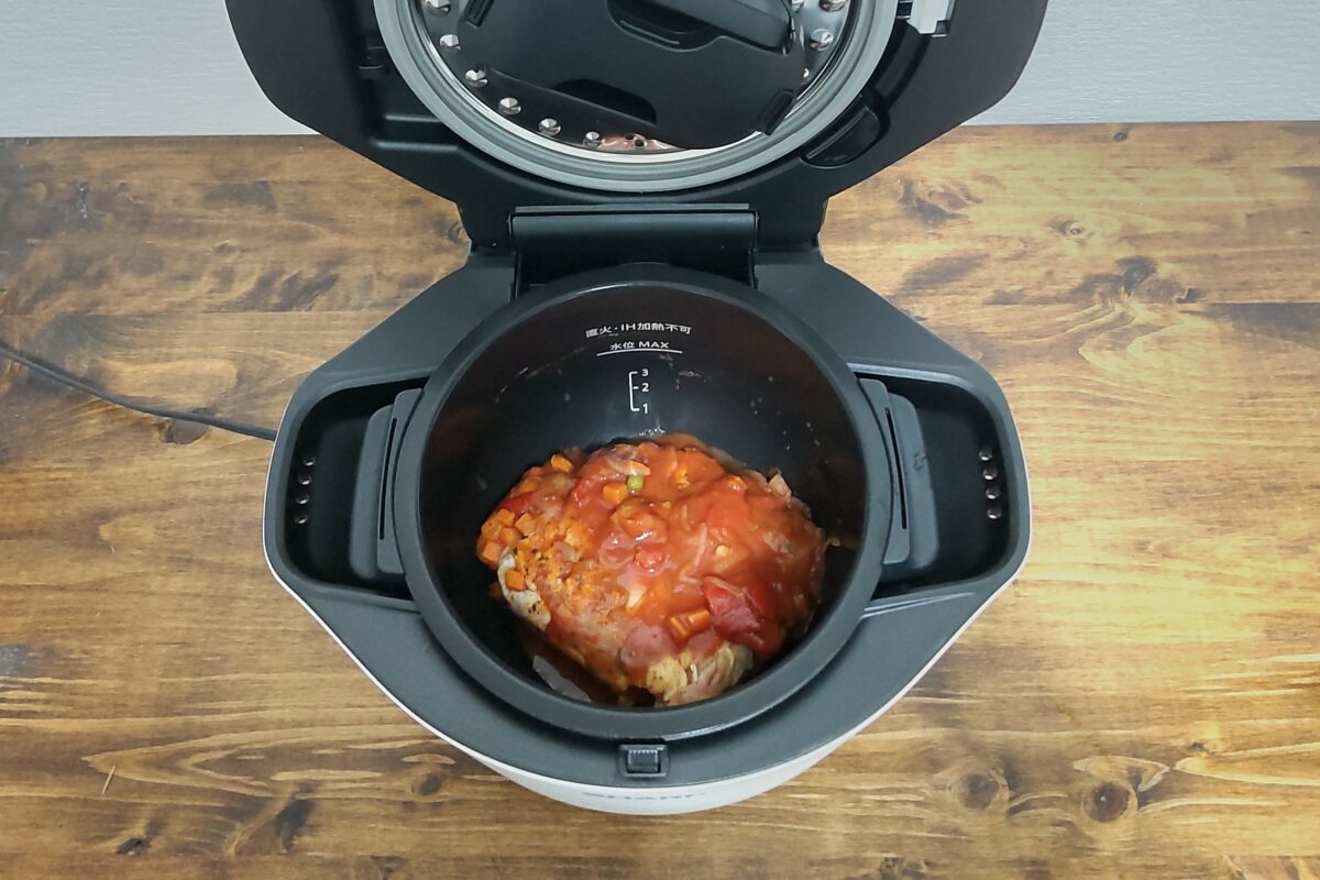 一般的なトマト煮のレシピを調べると、刻んだ野菜を用意したり、20~30分は煮込まないといけなかったりするのですが、そんな手間はかかりません。火を使わないので、キッチンで汗ダラダラも回避できました。ササっとできるのに、味付けはしっかり、鶏肉もたくさん入っていて大満足でした。