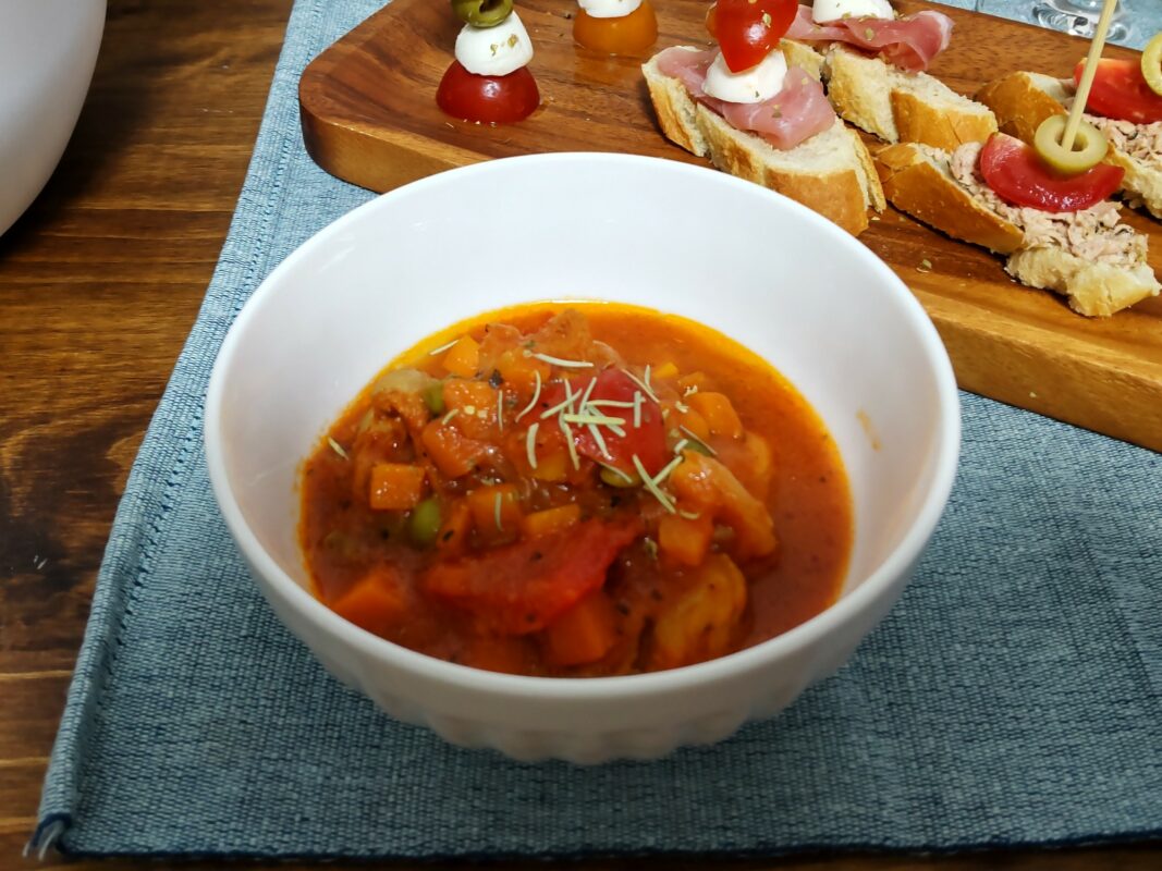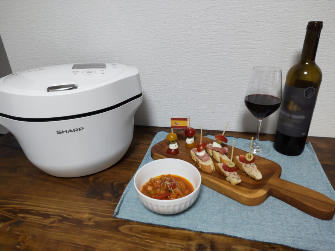 彩りにローズマリーを振りかけて完成です。調理中の空いた時間で、串に刺すだけのピンチョスも用意しました。ほったらかしにしてる時間を活用できるので、急なホームパーティーなんかもできそうですね。試飲した勢いで購入したスペインワインとともにいただきます。
