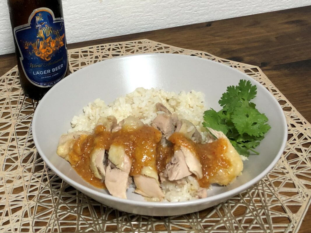 そして完成したのがこちら。パクチーを添えて雰囲気を出してみました。調理が簡単すぎて、「写真映えするように…」と考えて盛り付けする方が手間になったほどです。45分の調理中は外出もできるので、シンガポールでおなじみのビールも調達できました。