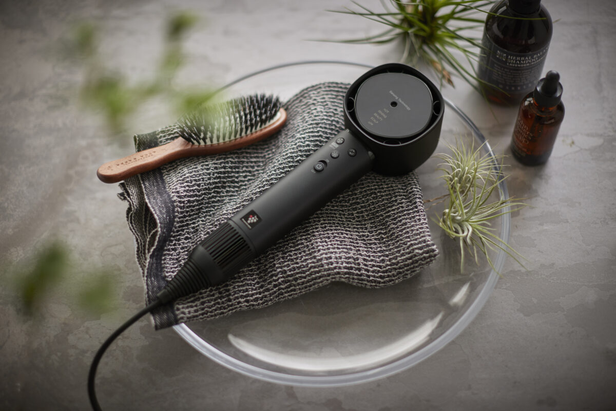 先日発売開始したドライヤー最新機種の形を体で表現してください