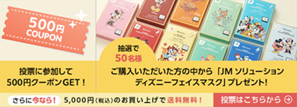 商品の人気投票を含むアンケートにご協力いただいた方全員に、1月31日(水)までの期間中何度でもご利用いただける500円クーポン※1をプレゼントしています。さらに、「ヘルシオデリプレミアム」を購入いただいた方の中から抽選で50名の方に「JMソリューション ディズニーフェイスマスク」※2をプレゼントいたします。