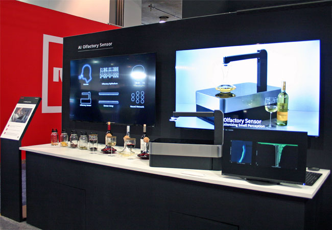ディスプレイ基板技術の転用によって生物の嗅覚を模したにおいセンサを実現。においのイメージ化によりAIでの処理、判断が可能なため、におい物質の量を測定する方式に比べ、より複雑なにおいを判定します。