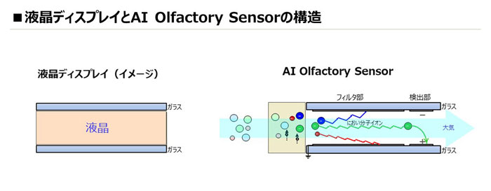 はい。FA-IMSセンサはスキマに分子イオンを流して解析します。私が元々担当していた液晶ディスプレイは、2枚のガラスの間(=セル)に液晶が入っていますが、ここに液晶ではなく、分子イオンを流すように設計したらFA-IMSのシステムが構築できるんじゃないかとひらめいたんです。「AI Olfactory Sensor」の独自技術は、ガラスのセルでFA-IMSの素子を作ったことと、データをイメージ化しAIを導入したところです。上述の通り、精度が高いのはもちろんのこと、長年培った液晶ディスプレイの量産技術や装置を転用すれば良いので低コストにもなります。