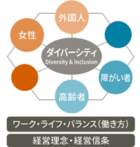 当社のダイバーシティの考え方は、1973年に制定された経営理念の中で「会社に働く人々の能力開発と生活福祉の向上に努め、会社の発展と一人一人の幸せとの一致をはかる」として明示され、従業員が互いの個性を尊重し合うことで新しい価値を生み出し、お客様と共にひとつ先の未来を作る「生活創造商品」の開発とサービスの提案につなげることを目指しています。