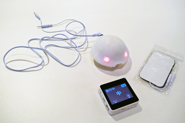 ケーブルで繋いだ電極パッドを下腹部(腹直筋下部)に貼り付け、操作スイッチを入れると、下腹部に電気刺激が起きる仕組みです。