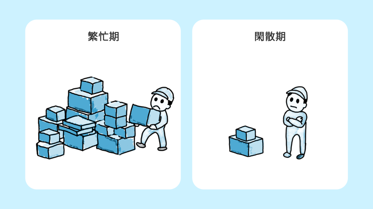 繁忙期のピークに合わせて保管スペースや人員を配置すると、閑散期には余剰となるため、高コストになってしまいます。