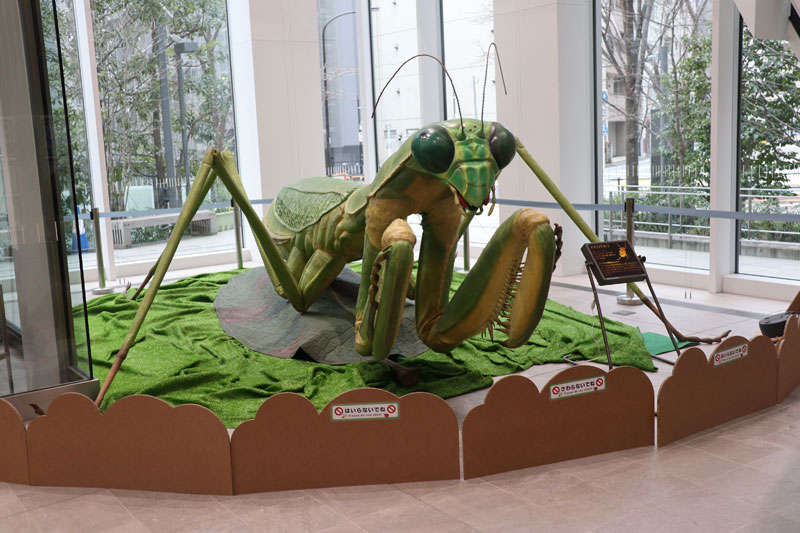 この企画展では、当社の「ネイチャーテクノロジー」のように昆虫の特長を取り入れて開発された製品をはじめ、巨大なオオカマキリやカブトムシの模型、昆虫の「擬態」などの「すごい!」所の解説が展示されています。