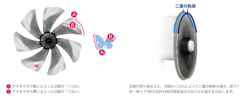 この扇風機には、「アサギマダラ蝶」の羽根を応用した「ネイチャーウイング※1」を採用しています。海を渡り、数千キロも旅をする「アサギマダラ蝶」の羽根の「くびれ」と羽ばたく時の「うねり」を応用することで、7枚の羽根で14枚相当のムラの少ない、なめらかな風を届けます。さらに、「ネイチャーウイング」には手足の冷え過ぎを抑える効果※2もあります。