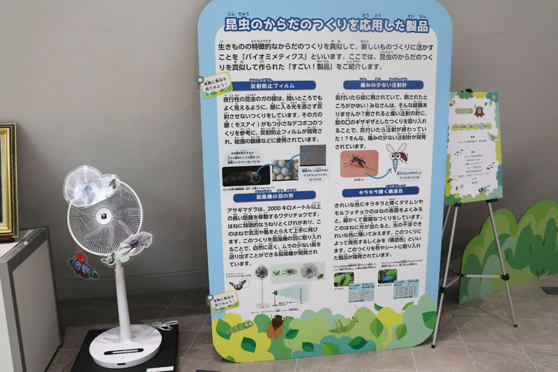この「ネイチャーテクノロジー」を搭載した扇風機を、東京都港区立みなと科学館のイベント『2024春の企画展「すごいぞ!昆虫総選挙」』に展示しています。身近な昆虫たちのさまざまな「すごい!」に注目し、「すごい!武器」や「すごい!身体能力」などを紹介する巨大なオオカマキリやカブトムシの模型、昆虫の「擬態」などの「すごい!」ところの解説などが展示されている中、「昆虫のからだのつくりを応用した製品」として紹介しています。