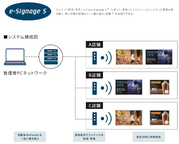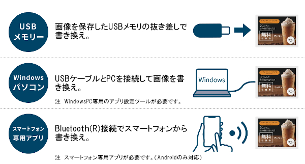 また、スマートフォン経由以外にも、USBメモリーやWindowsPC、当社が提供するデジタルサイネージソフトウェア「e-Signage S」(別売)など、4つの書き換え方法が選べますので、お客さまの利用環境に応じた使い方が選べます。