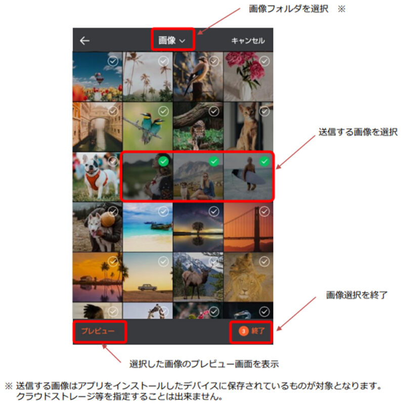 ここで送信する画像を変更(追加・削除)する場合は、画面右上のアイコン(赤枠)をタップすると選択画面に戻ります。