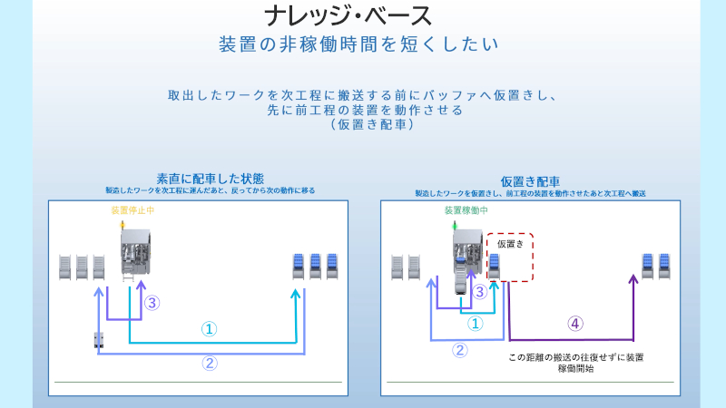 これが「仮置き配車」というナレッジです。人が物を運ぶならこのようにするという当たり前の作業でも、自動搬送の現場ではできていないことのほうが多いのです。ナレッジのひとつひとつはわずかな生産タクトタイム(1台生産するために必要な時間)短縮効果であっても、このような工夫をさまざまな搬送経路で行うことで、全体の生産性は大きく変わっていきます。