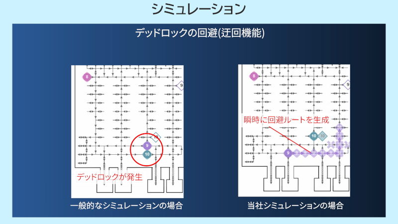 一般的に使われているシミュレータの場合は、入力できる情報が限られるため、AGV同士の経路が重なり、デッドロックという状態に陥ることがあります。実際には、デッドロックを回避するための迂回経路を生成して走行するのですが、この動きをシミュレーションできないと、全体の生産性の計算はできないことになります。