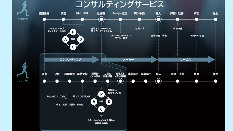 私自身には蓄積された経験はありませんが、シャープでコンサルティングサービスの提供に従事する者はプロですので、豊富な経験やナレッジを持っています。その内容をお伝えするのが私の役目だと思っています。お伝えしたことを新しいお客さまの現場で活用していただくことも、お役立ちの一つだと思うからです。