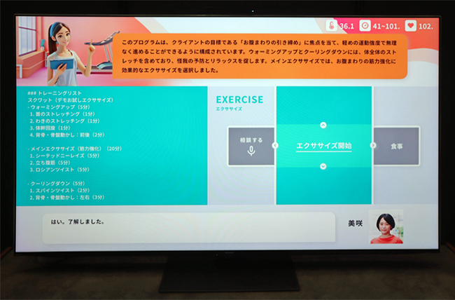 大画面テレビとカメラを活用し、AIトレーナーとの自然な会話から、リビングで気軽にエクササイズなどができます。