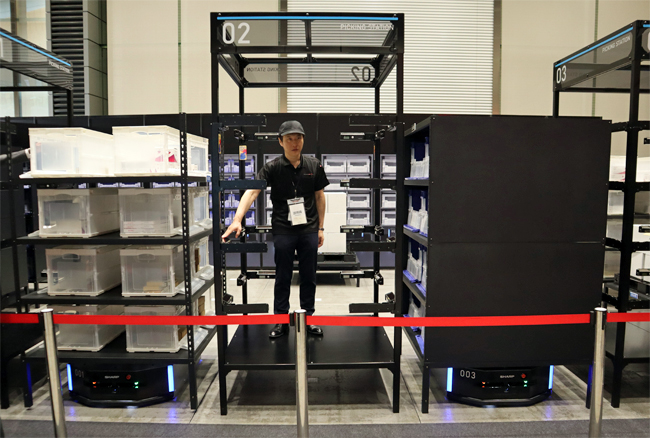 物流倉庫で増大する日々の複雑なオペレーションの効率化を図るため、「シミュレーテッド量子アニーリング(SQA)」技術を応用した業務革新の一例として紹介する、自動搬送ロボットを使った商品の保管/搬送システムです。