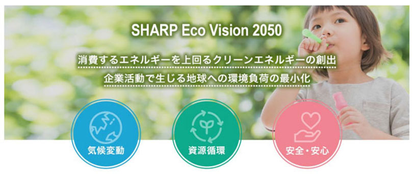 2019年に策定した長期環境ビジョン「SHARP Eco Vision 2050」実現に向け、「気候変動」「資源循環」「安全・安心」の3分野それぞれに長期的なゴールを定め、「消費するエネルギーを上回るクリーンエネルギーの創出」および「企業活動で生じる地球への環境負荷の最小化」に取り組むことを紹介しています。