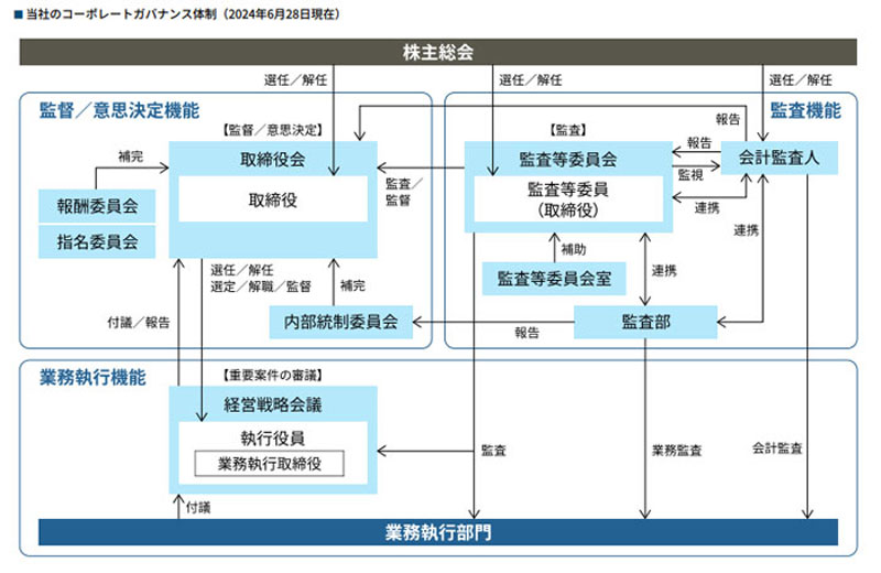 こうした考えから、社外取締役を選任し、また、監査等委員会を設置することで、取締役の職務執行の監督機能の強化および取締役会における意思決定の機動性を高めるとともに、執行役員制度の導入により、監督/意思決定機能と業務執行機能を分離することで、迅速かつ効率的な業務執行を着実に遂行できる体制を構築していることなどを紹介しています。