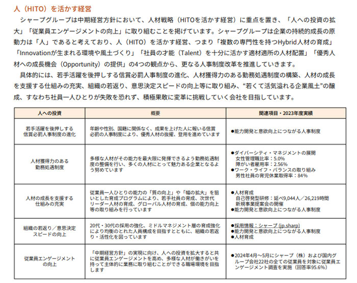 経営理念には「社会への貢献」「会社の発展」「社員の成長と幸せ」を追求する基本姿勢を示しており、シャープグループはこの理念のもと、一貫して人材の成長支援と活用を行っています。