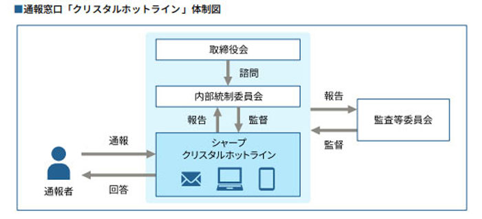 コンプライアンス経営を確実に実践するため、継続して取り組んでいることを説明。そして、一人ひとりが遵守すべき具体的な基準を示す「シャープグループ・コンプライアンス・ガイドブック」を策定し、徹底を図っていることや、社内規程・社会通念・倫理全般を逸脱した言動に関する総合通報窓口「クリスタルホットライン」、職場でのハラスメントに関する専用の社内通報窓口「ハラスメント相談窓口」などを設置していることを紹介しています。