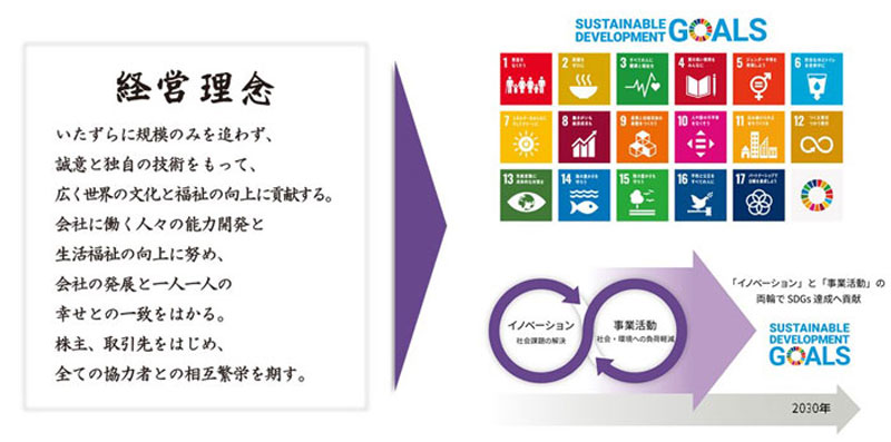 1973年に明文化したシャープの経営理念には、「広く世界の文化と福祉の向上に貢献する」「株主、取引先をはじめ、全ての協力者との相互繁栄を期す」などの言葉で、2015年に国連で採択された「持続可能な開発目標(SDGs)」に通じる考え方が盛り込まれています。シャープはこの経営理念のもと、「事業や技術のイノベーションを通じた社会課題の解決」と「サステナブルな事業活動による社会・環境に対する負荷軽減」を両輪としたESG経営の推進により、SDGs達成への貢献を目指し、地球上の「誰一人取り残さない(leave no one behind)」持続可能でよりよい世界の実現に貢献していくことを説明しています。