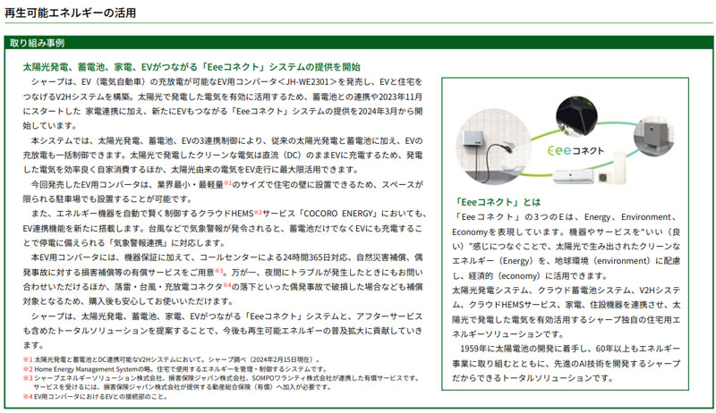 また、太陽光発電・蓄電池・家電・EVがつながる「Eeeコネクト」システムや宇宙用/高効率太陽電池、メガソーラーなど再生可能エネルギーの活用についての情報を充実させました。