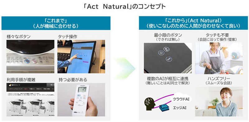 (海老原)「Act Natural」とは、シャープが生成AIで提供する価値のことで、AIと人間がどういった接し方をするかを2つの単語に凝縮しています。具体的に言うと、いままでは、複雑な利用手順を理解した上で、利用者が家電や機械の操作方法に合わせてボタンを押したり、タッチしたりといった行動をする必要がありましたが、これからは、AIが人間に寄り添ってくれて、自然な動作や会話の中で、知らず知らずのうちにAIからサポートを受けることができるようになるというコンセプトを「Act Natural」と呼んでいます。