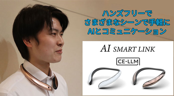 (樋口)内蔵マイクを用いた音声による生成AIとの自然なコミュニケーションが可能で、開発中の当社独自のエッジAI技術「CE-LLM」(Communication Edge-LLM)を搭載しており、ハンズフリーで、さまざまなシーンで手軽に利用者のサポートをしてくれるウェアラブルデバイスです。カメラ搭載モデルは、インタラクティブな会話に加え、カメラで利用者の周囲の状況を判断しますので、より精度の高いサポートが可能です。