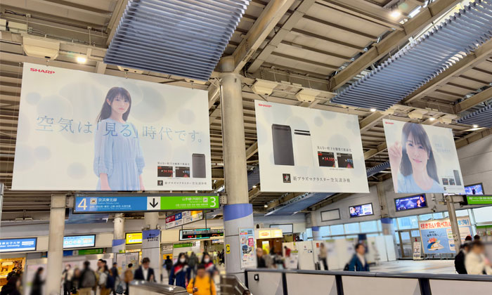 次に向かったのは、JR品川駅。ここでは、多数のサイネージを使用した2種類の浜辺美波さんの広告が並んでおり、それぞれ異なる表情で空気清浄機の魅力を伝えています。また、駅の目立つ場所にはビッグフラッグの広告も掲示されていて、より多くの方に空気清浄機の情報を届けています。周囲の人々が立ち止まり、思わずその広告に見入る姿が印象的でした!