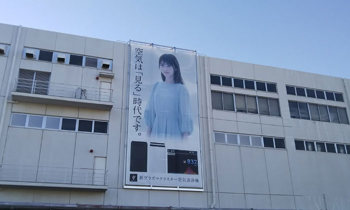 そして、私の旅の締めくくりはシャープの八尾事業所。こちらは大阪にあるシャープの拠点で、JR大和路線 久宝寺駅近くでから大きな懸垂幕を見ることができます。浜辺美波さんの優しい表情が印象的なこの懸垂幕は、通りすがりの人々の目を引き、その魅力に惹きつけられる姿が見受けられました。八尾事業所周辺にお越しの方はぜひご覧ください。