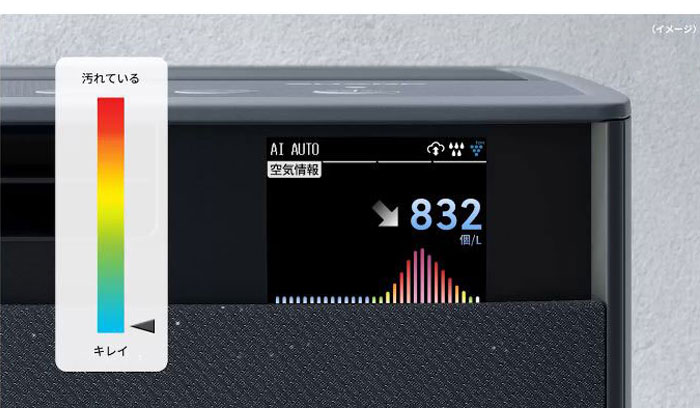 本体内蔵の高感度ホコリセンサーと独自アルゴリズムを組み合わせることで、空気中の1μm相当の微小粒子(細菌やタバコの煙)を算出します。新搭載の「AIモニター」機能により、室内に浮遊する粒子の数と色を可視化し、過去30分間の粒子数の変化も表示できます。さらに、検知した粒子数に応じて風量を11段階で調整する「AI AUTO」モードを搭載し、食品工場などで求められるクリーンルーム規格Class8レベルの空気環境を提供することを目指しています。