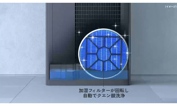 新たに搭載された「加湿内部洗浄」機能では、加湿トレーにクエン酸と水を入れ、ボタンを押すだけで加湿フィルターが自動的に回転し、洗浄を行います。これにより、面倒なフィルターのお手入れが簡単にでき、清潔にご使用いただけます。さらに、操作ガイドや洗浄の残り時間は「AIモニター」に表示され、従来よりも凹凸が少ない新形状の「フラットトレー」を採用することで、清掃性も大幅に向上しました。