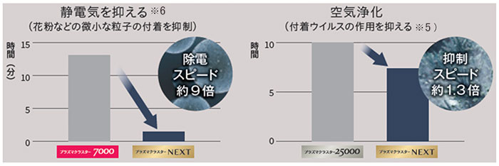 ※6 ●試験機関:当社調べ ●試験方法:約41m3の試験空間で5kVに帯電させた試験板で、0.5kVまで除電するのに要する時間を測定。